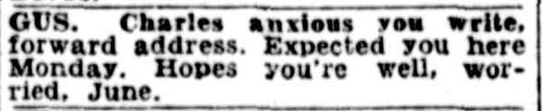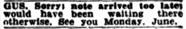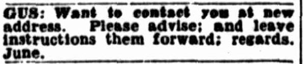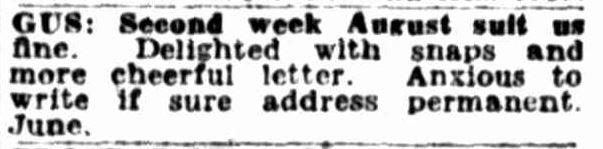 Plans were made and then confirmed through the paper. Outside of the personal ads, they also wrote letters and sent photos. Gus however may have been moving around as the message below indicates that there was uncertainty over whether the address was permanent.