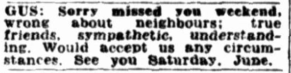 This is the story of Gus and June. From 1950 until 1951 messages between the couple were placed on an almost monthly basis in the personal column of The West Australian.