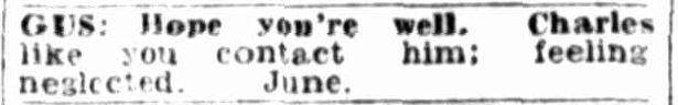 From that point on no other messages appeared in the paper addressed to either Gus or June. Their connection and their correspondence in the newspaper (fleeting as it was) came to an end. We however are left with a great deal of questions. Who was Gus and June? What were their stories? Why were they leaving messages in the newspaper?