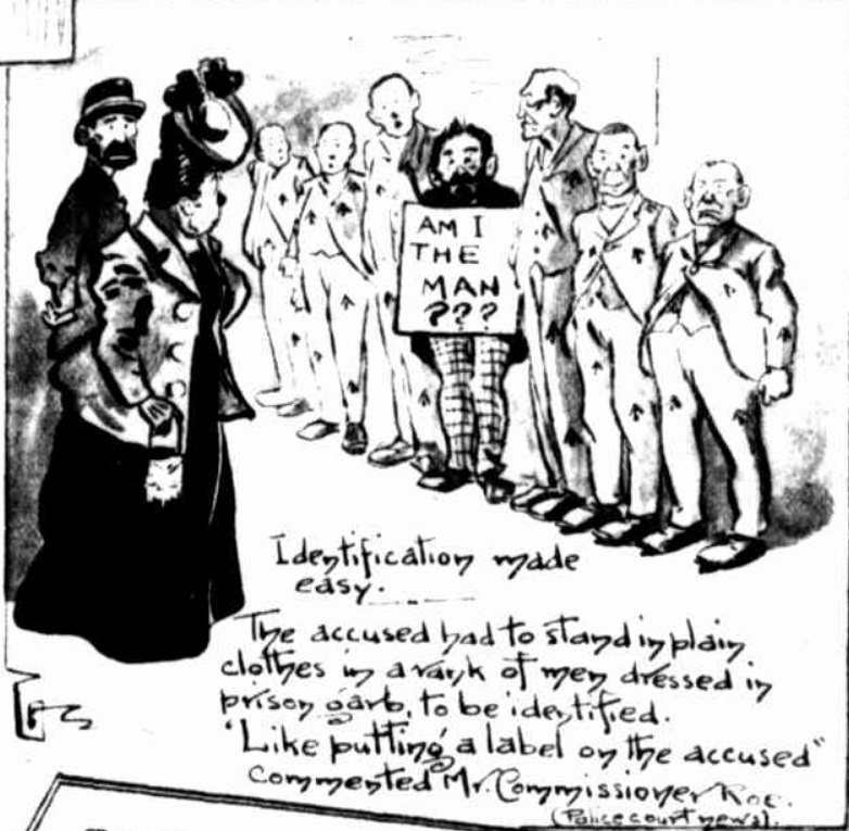 The complainant (an older man who’d been drinking) stood before them and at first was overwhelmed by the “dazzling glare in the prison yard“. He picked the wrong man. The police gave him another go and that time he chose the right man.