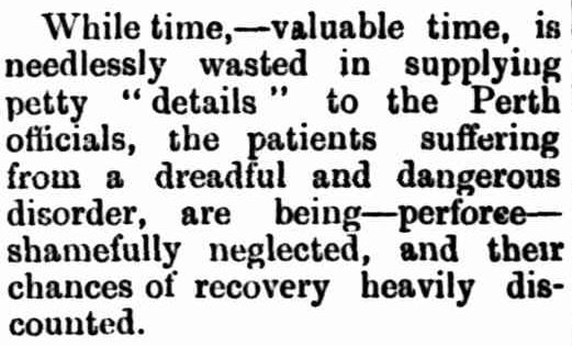 Four days later the Legislative Council sat in Parliament and John Drew added his voice to the criticism. He stated that he was going to move for the appointment of a Select Committee to look into the Central Board’s conduct. He believed the patients had died from neglect and, due to the Board’s inaction, had “…practically rotted to death.” That move was eventually made in sittings held on 8 August and was carried.