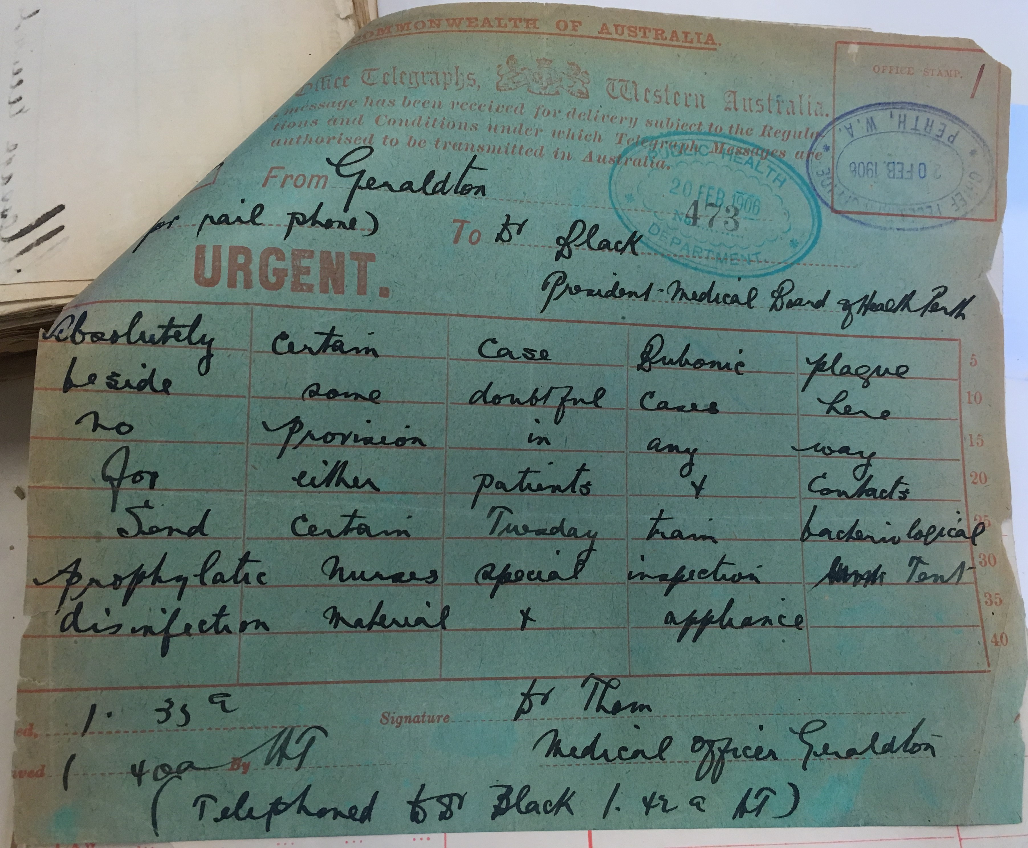 - Courtesy of the State Records Office of Western Australia (AU WA A 34 Central Board of Health; S268 – Files – General; AU WA S268- cons1003; 1906/0473A; Geraldton – plague).
