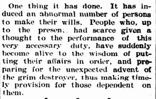 While I’m sure there was a palpable sense of relief at being given the all-clear, the aftermath of the bubonic plague continued to be felt in other areas. Businesses had stagnated and tradespeople were suffering because of it. Hotels had a high vacancy rate and many bedrooms were shut up and locked. No one was eating meals at restaurants and the proprietors had noticed the obvious reduction in patrons. The whole town had become “partially paralysed“. The only thing that was noted to have seen an increase in activity was the amount of people making their Wills.