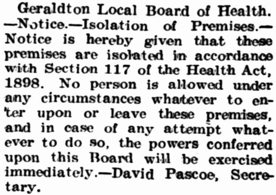 Geraldton meanwhile was in a state of panic. Residents approached the Geraldton Express to air their opinion that the Mayor should hold a public meeting for the express purpose of telling them all that he knew. They also wanted an answer to an important question: why had it taken so long to diagnose the illness as bubonic plague.