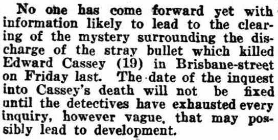 - 1932 ‘BRISBANE-STREET TRAGEDY.’, The West Australian (Perth, WA : 1879 – 1954), 13 December, p. 9. , viewed 23 Mar 2019, http://nla.gov.au/nla.news-article32590793