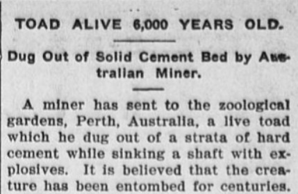 - 1907 ‘RELEASE OF AN ENTOMBED TOAD.’, The West Australian (Perth, WA : 1879 – 1954), 25 July, p. 4. , viewed 04 Mar 2019, http://nla.gov.au/nla.news-article25708613