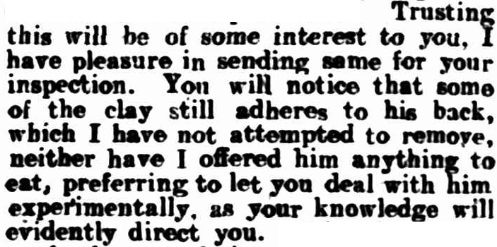 What became of the frog afterwards is not known. The Evening Star (Boulder) claimed in their article that Mr Le Souef intended to examine its organs, which surely meant that it would be killed. On the other hand they stated that it may be placed in clay in the hope that it would again become inanimate and that Mr Le Souef would then attempt to reanimate it. Neither option sounded particularly positive for the frog.