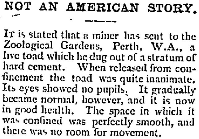 - 1907 ‘THE ENTOMBED TOAD.’, The West Australian (Perth, WA : 1879 – 1954), 26 July, p. 2. , viewed 04 Mar 2019, http://nla.gov.au/nla.news-article25708697