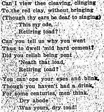 The frog soon became a source of inspiration with poetry being the popular mode of expression. ‘Needle’ wrote for The Daily News and composed several silly poems including the following ode to a toad.