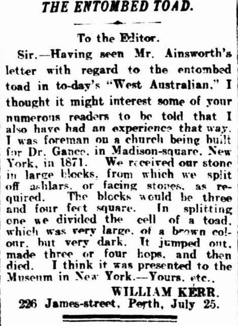 Despite Harry’s well-articulated letter, there was some doubt as to the legitimacy of the story. Could it simply have been an elaborate scam? Others however had their own entombed amphibian story and William Kerr was one such person. He shared his story in a letter to the editor.