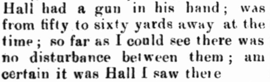 More people were interviewed and further details concerning Hall’s movements came to light. On 20 March John Trigwell gave Hall two bullets. On the same day Richard Hunter loaned Hall a gun to shoot a dog. Not trusting him with two bullets, he took one away. An eye witness named Jeremiah Murphy further placed Hall at the scene. He saw him at Ah Yet’s garden at 2 pm, talking and carrying the gun on his shoulder. Ah Yet was standing inside the fence and Hall was standing outside.