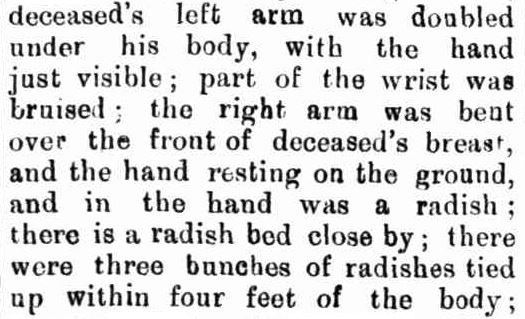 The blood and the position of the body led Corporal Slattery to suspect foul play. Ah Yet was killed while going about his day; lying partly under his head was a straw hat and grasped in his hand was a radish.