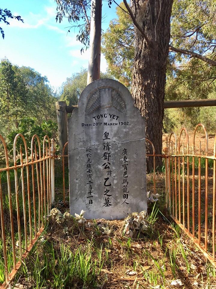 Ah Yet was buried in the back right corner of the Donnybrook Cemetery. A headstone was erected over his grave and a fence placed around it. In English at the top, the headstone describes the grave as belonging to Tung Yet. Written in Chinese below are further details of his name, place of birth and death.