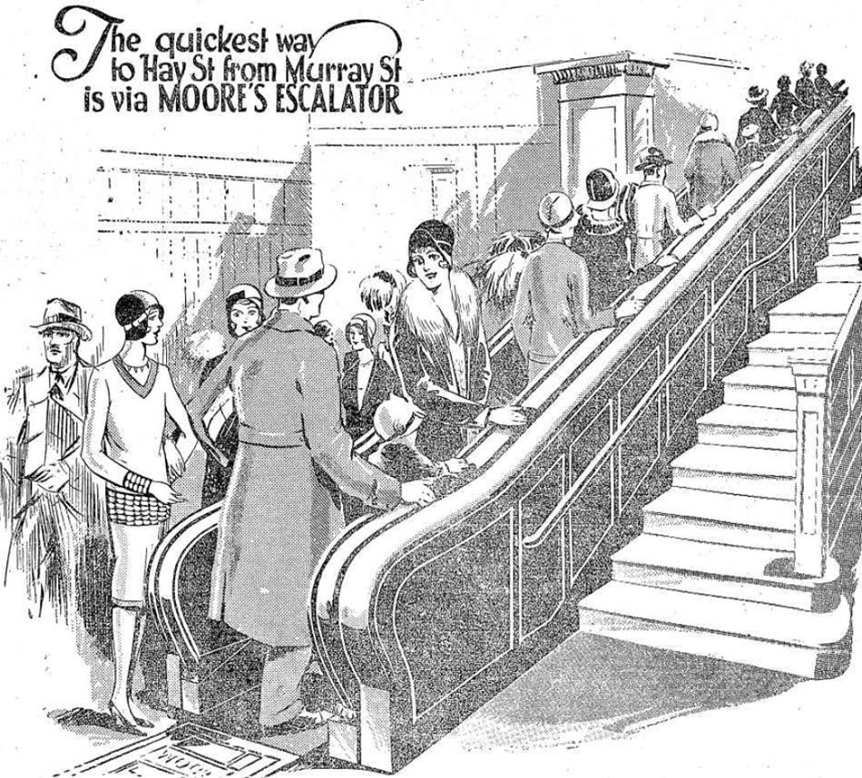 As early as 1898 Western Australians were aware of the invention of the moving stairway (escalator) when The Daily News published a story about Bloomingdale’s (New York) installing it in their store. It allowed shoppers to go from floor to floor, from department to department without having to move and was “like the magic carpet of the Arabian Nights“.
