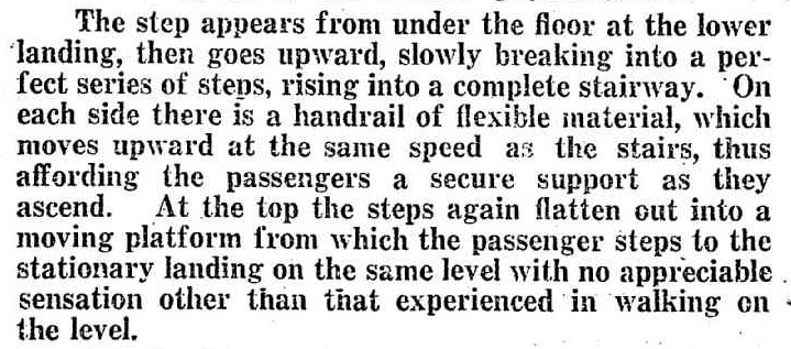 For those unfamiliar with the concept of the escalator, a detailed description as to how it worked was provided. Modern day readers will find nothing new in it however it is nevertheless a charming reminder of how something commonplace in today’s world was once new and exciting and warranted explanation.