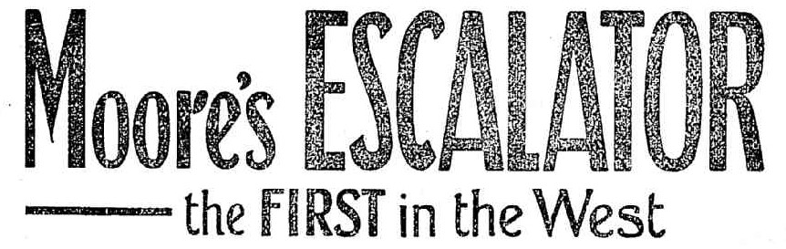In any case, see MOORE’S ‘ESCALATOR’ SPECIALS whenever you are in town; to go home without having done so would be to throw money away.