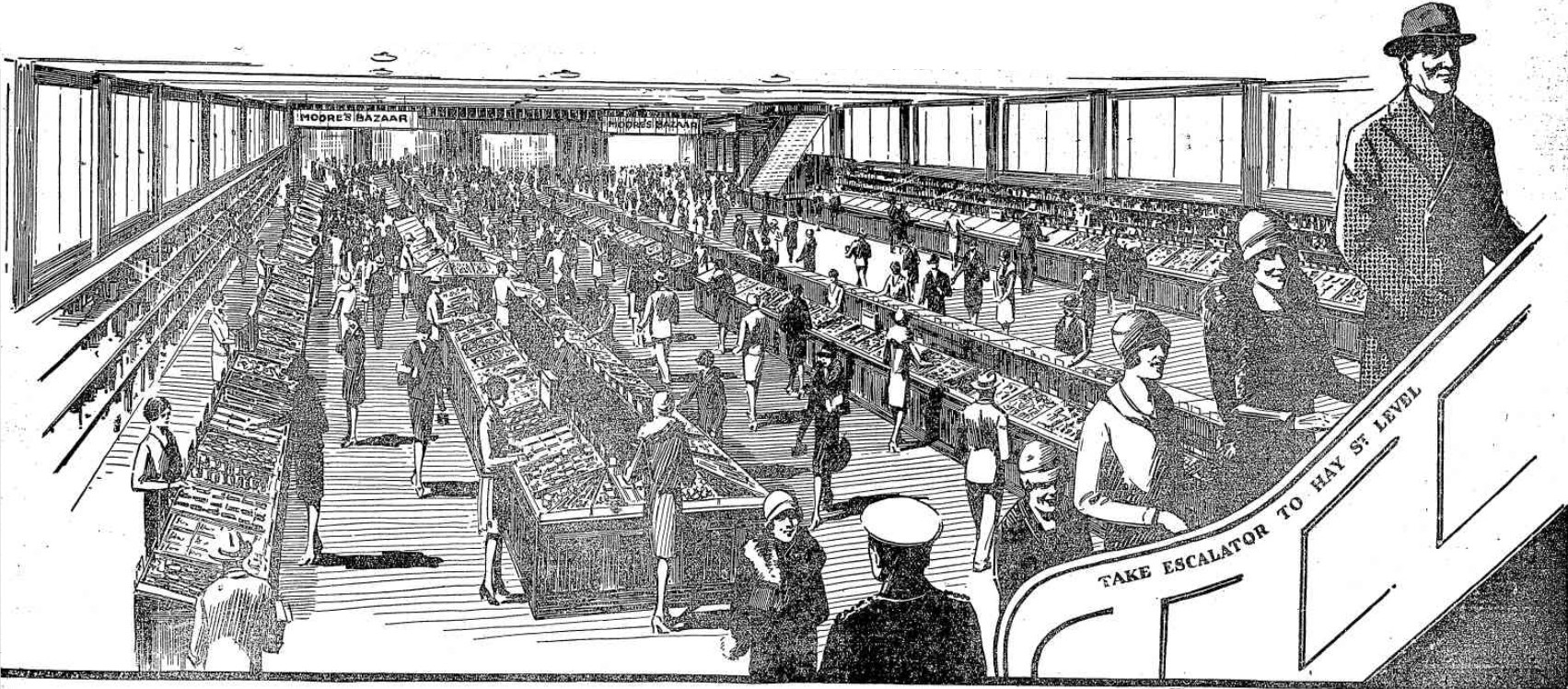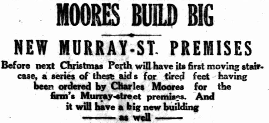 On 18 February 1928 the Mirror announced that Moore’s Department Store in Perth was expanding. They already had a shop fronting Hay Street and were planning to construct a new building that fronted Murray Street. The ground floor of the new building would connect to the basement in the old one while the main floor of the Hay Street building would connect to the top of the Murray Street building. To enable the public to travel from one floor to another, lifts and staircases would be provided as well as an escalator.
