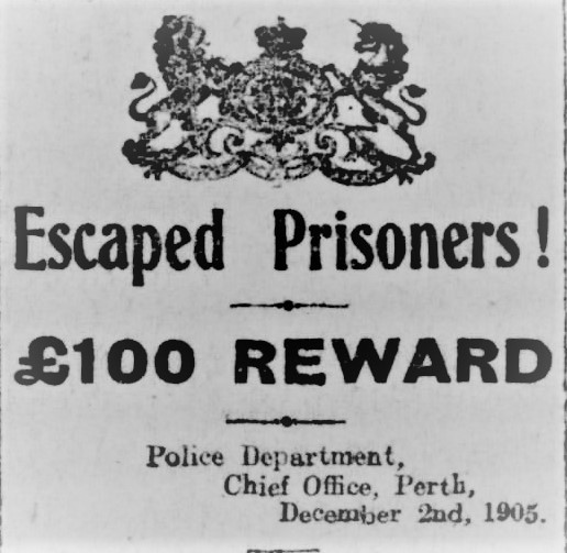 A month went by with no news. However, after another escape from Fremantle Prison as well as the escape of three prisoners from Rottnest Island, the Police Department decided to offer a reward of £100. £20 for each man for information that would lead to their apprehension. Descriptions of the men were placed in the newspapers and photographs were posted outside the Criminal Investigation Branch on Beaufort Street.