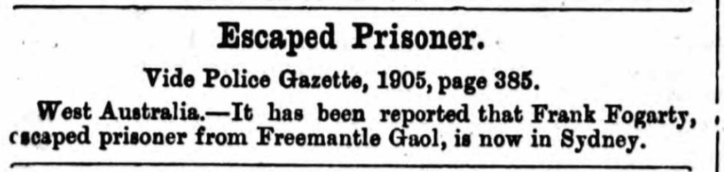 Over six months had passed since he was last seen and it was clear Fogarty had most likely left Western Australia. While the date and means of his departure is unknown, there is a clue as to his destination. In the New South Wales Police Gazette dated 9 May 1906, it was reported that he was in Sydney.