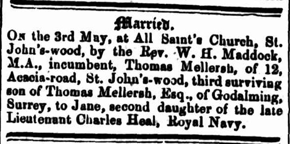 On 5 January 1862, Jane and Fanny left Perth and sailed on the ‘Gloucester‘ bound for London. The journey took three months and one month after their arrival, on 3 May 1862, Thomas and Jane were married in All Saints Church in St Johns Wood. Witnessing their union was another settler, Charles Wittenoom, as well as their daughter, Fanny.