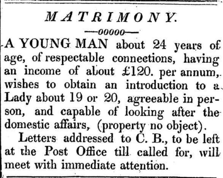 The first matrimonial advertisement printed in a Western Australian newspaper was placed by ‘C.B.’ in 1833. The author was a young man aged 24 on an annual income of £120. He wished to be introduced to a lady aged about 19 or 20, who was agreeable and capable of looking after domestic affairs.