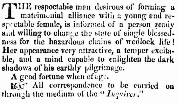 Again four years passed, indicating that matrimonial advertisements may have been deemed too risky in such a small colony. Nevertheless, the first ad placed by a female occurred in 1841. Attractive and excitable, she wanted to make an alliance with a respectable man who was “willing to change the state of single-blessedness for the hazardous chains of wedlock life!“