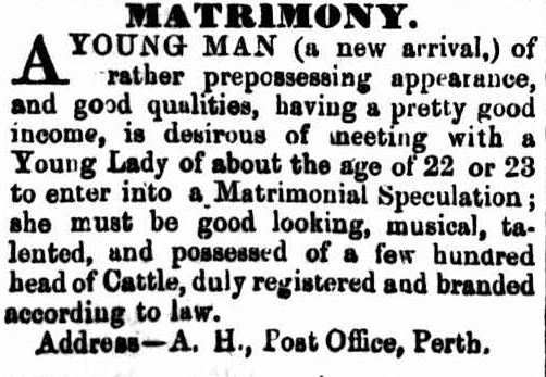 A positive of matrimonial advertisements was that people could write down what they desired in a spouse. Their only limit was the amount of money they had to spend. In 1858 ‘A.H.’ hoped to meet a young lady who was 22 or 23, good looking, musical, talented and (very specifically) possessed “a few hundred head of Cattle, duly registered and branded according to law.“