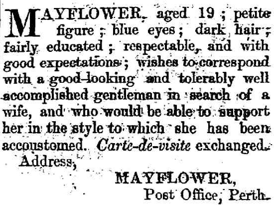 In 1879 ‘Mayflower’ advertised in the Victorian Express (Geraldton) that she wished to correspond with a good-looking gentleman who would “support her in the style to which she has been accustomed.“