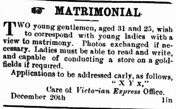 Matrimonial newspaper advertising increased as people poured into Western Australia to take advantage of the goldrush. Many people lived in areas where there was a larger population of males compared to females. Perhaps they thought their best chance to find a spouse was through advertising in the newspapers. In 1893 two young men did exactly that. They did not mention looks; they requested ladies who could read and write and could operate a store on the goldfields.
