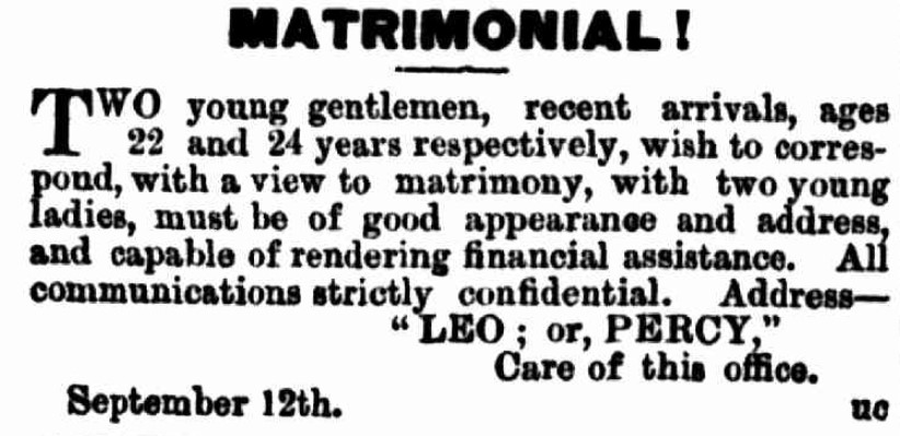 On the other hand, two recent arrivals, Leo and Percy, were direct. They hoped to correspond with two ladies of good appearance who were able to render financial assistance.