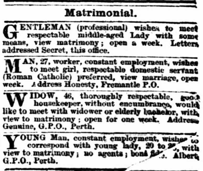 Matrimonial advertising was used by many people who wanted to marry. As Europeans immigrated to Western Australia, they found themselves living in a remote location with a limited social circle. Placing an ad in the newspaper was the answer to a difficult situation. It offered hope that they would find a partner to share their life. While it was frowned upon by some classes of society, ultimately, the possible benefit far outweighed the risks.