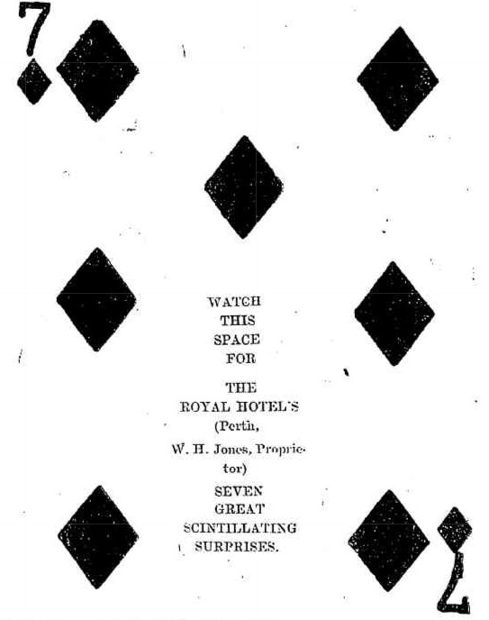 The mystery of the seven of diamonds and the meaning behind it remained unsolved until early September. Those who guessed that it was an advertising stunt were correct. On 2 September 1921, a large seven of diamonds was printed in The Australian. Advertising The Royal Hotel in Perth, it advised the reader to “watch this space” for “seven great scintillating surprises.“