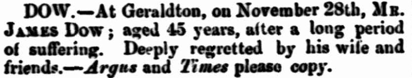 - Midwest WA Heritage website for the biographical details of James Dow and information obtained from their Death Register.