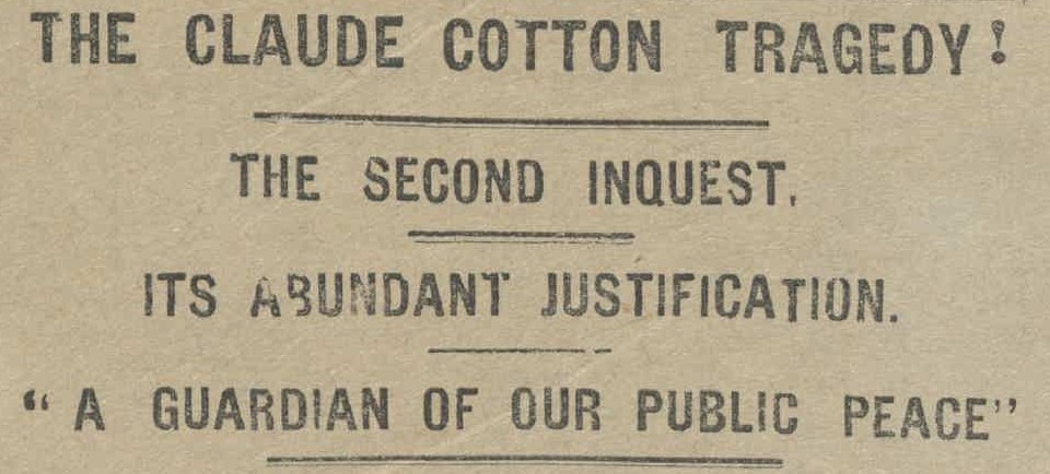 There was a large attendance at the inquest into Claude Cotton’s death at the Police Court yesterday. All the seats allotted to the public were filled, and many who were present had to stand.