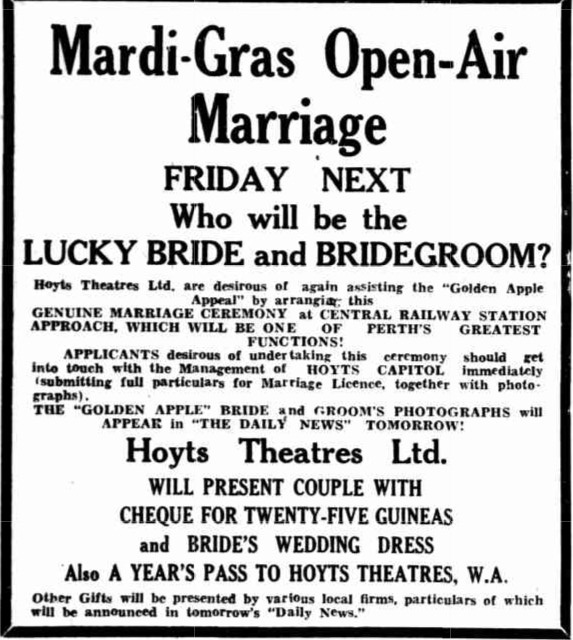 The ceremony was to take place at 1 pm at the railway reserve in front of the Perth Train Station. Couples eager to get married and interested in being publicly married were encouraged to visit Hoyts Theatres to put their names down. Hoyts was to fund the entire wedding and provide everything associated with it. They would receive a travelling case, bridal shoes, bridal gown, suit, wedding ring, wedding cake, bouquets, and photographs. On top of that, there was a cheque for £25 and a year’s pass to Hoyts Theatres. Temple Court Cabaret would host the wedding breakfast, and the newlyweds would also receive an aerial honeymoon trip provided by W.A. Airways and a week’s stay at Rottnest Island.