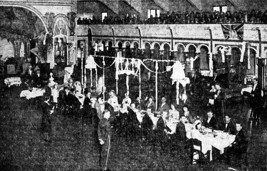 The ceremony ended, the photographer snapped photos, and the bride and groom exited the theatre amidst cheers and clapping from the large crowd outside. Hopping into a car, a driver whisked them away to Temple Court Cabaret for the wedding breakfast. Greeting them inside was a “colourful scene.” A prettily decorated table was in pride of place in the middle of the floor. Seated and watching from the gallery were members of the public. Raffle tickets were on offer and gave those in attendance the chance to win the top layer of the wedding cake, with the proceeds going to the Golden Apple Appeal. Throughout the breakfast, the Temple Court Cabaret orchestra provided the music.