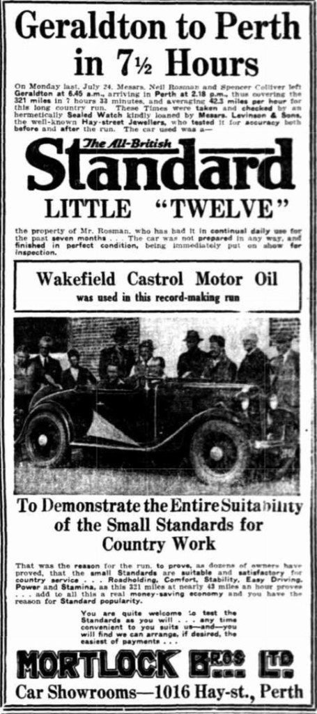 Advertisements for Mortlock Bros. in Perth quickly followed in the newspapers. The words “Geraldton to Perth in 7 ½ Hours” were printed in large font at the top of the ad, and included was a photograph of Neil and Spencer, sitting in the car not long after their arrival in Perth, and surrounded by well-wishers.