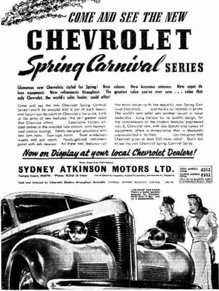 - Image of Sydney Atkinson Motors courtesy of the State Library of Western Australia; Chevrolet cars on display in a showroom [picture]; Illustrations Ltd; 1939; 019869PD
