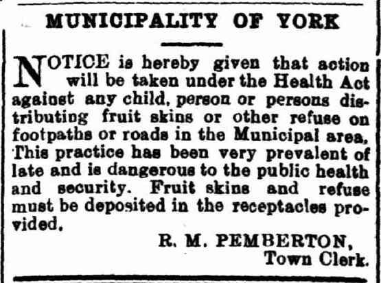 Despite such campaigns, the behaviour, at times, continued. During the Municipal Council meeting at York in 1942, the Medical Officer brought up the “strewing of fruit skins on the footpath.” The culprits were children coming to Avon Terrace to buy their lunch and then dropping the peel as they walked along. It was also people sitting in their cars and presumably throwing peel out the window. On one particular morning, an official counted dozens of banana skins on the footpath. The Council resolved to place an advertisement in the newspaper encouraging people to use the “receptacles provided.“