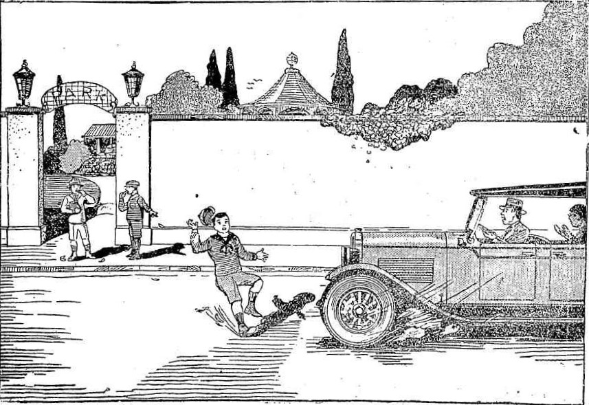 In 1930, the Royal Automobile Club initiated a ‘Safety First’ campaign aimed at school children. They created eight posters “setting forth the various dangers which beset the careless boy or girl who takes no heed of road traffic” and distributed them to public schools around the state. One illustration showed the dangers and the risk of accidents that came from dropping fruit peel.