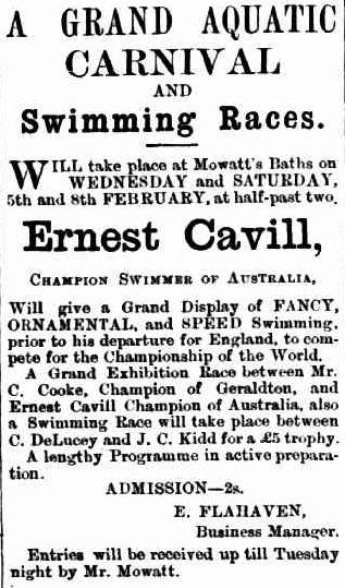On 5 December 1895, Ernest Cavill, the champion swimmer of Australia, arrived in Western Australia from Sydney. Before sailing to England to challenge Joseph Nuttall for the Championship of the World, he intended to stay in the west for a couple of months. During that time, if there was interest, he hoped to give exhibitions of diving, swimming, and various water feats.
