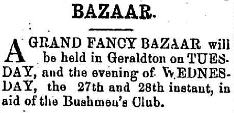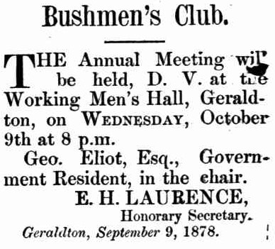 - 1878 ‘ANNUAL MEETING OF THE BUSHMEN’S CLUB GERALDTON.’, Victorian Express (Geraldton, WA : 1878 – 1894), 16 October, p. 3. , viewed 29 Aug 2021, http://nla.gov.au/nla.news-article212141287
