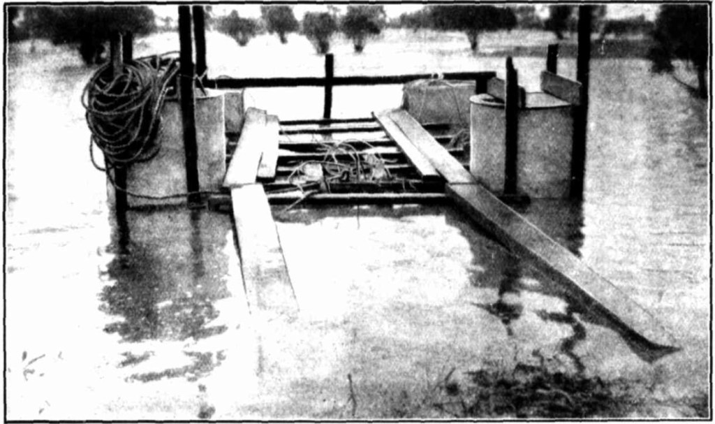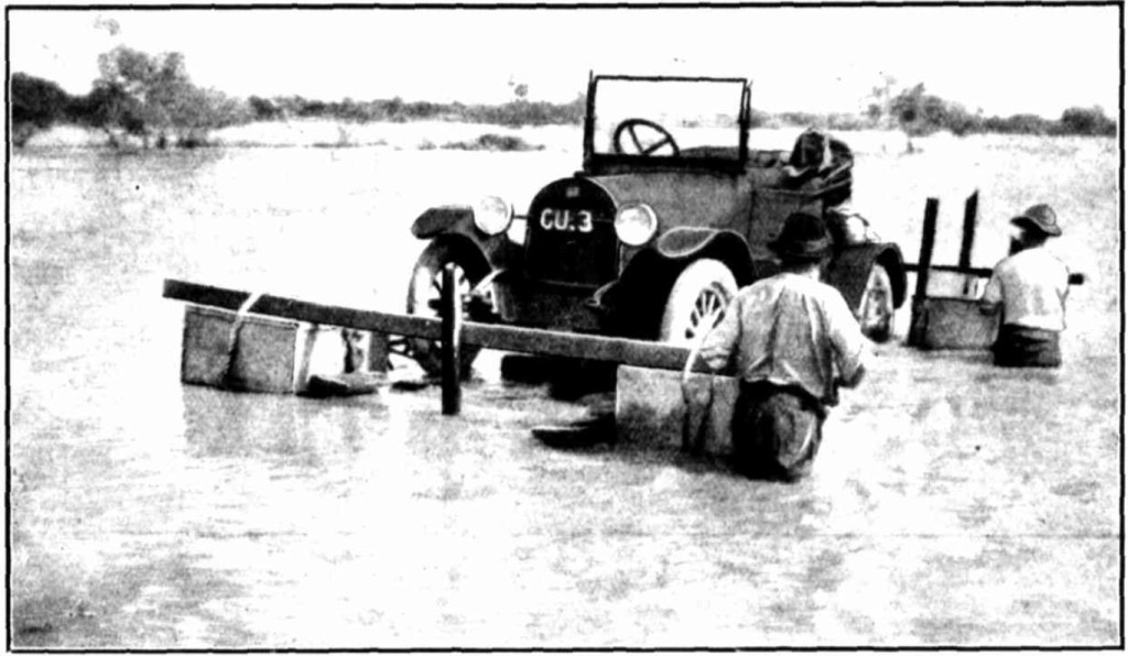For future reference, in case anyone else found themselves in similar spots of bother, Mr D’Arcy described the materials used, which were found on most stations. “Four 100-gallon tanks were used for the four corners, and the framework consisted of three long pieces of 5 x 3 jarrah, while the cross members were five pieces of 3 x 2 kauri.” In addition, two planks of 9 x 2 jarrah held the wheels of the car, while six more empty eight-gallon drums were attached to provide extra buoyancy.
