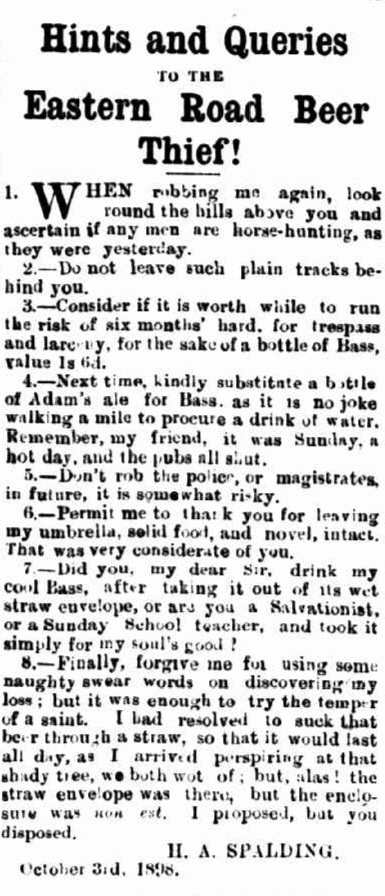 On a hot Sunday in early October 1898, Spaldo went to a park and found a shady tree. He brought with him an umbrella, a book, some food, and a nice cold Bass beer in a wet straw envelope. He left everything there, and when he returned, the beer was gone. Someone had stolen it! Most people, though annoyed, would simply move on from the loss. Not Spaldo. He placed an advertisement in the Geraldton Advertiser titled ‘Hints and Queries to the Eastern Road Beer Thief!’