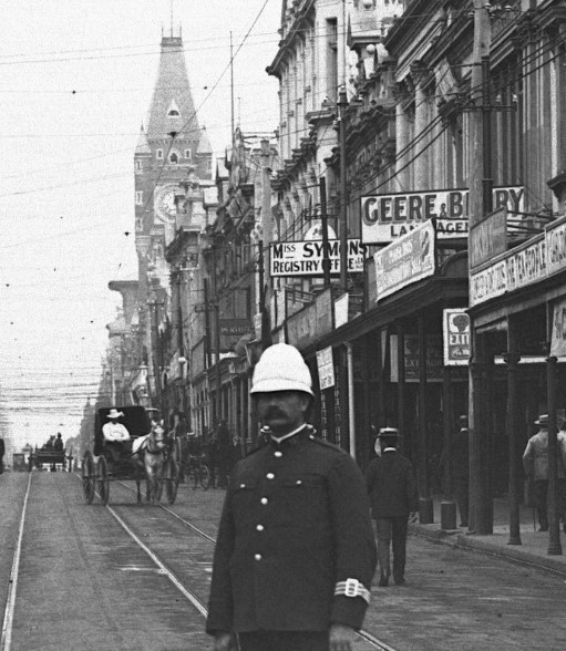 - State Library of Western Australia; Hay Street east from William Street with a policeman directing traffic in the intersection [picture]; E. G. Rome; 1906; Call Number: 009963PD.